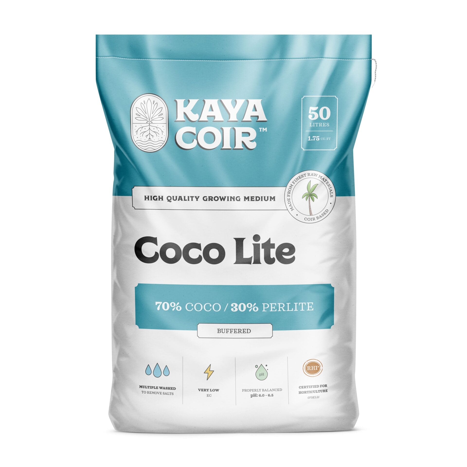 Kaya CocoLite combines RHP 70% high-quality buffered coco coir with 30% Perlite, providing excellent air and water management for robust plant development. This mix supports vibrant, healthy growth, with watering requirements adjusted by plant type,container size, and climate.