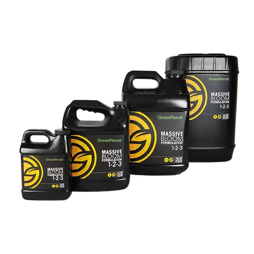 Green Planet Massive Bloom (1-2-3) is a comprehensive bloom additive that contains a full array of elements plants require to produce large, healthy flowers. Massive Bloom is formulated with L-form amino acids, a specially formulated vitamin profile, a unique blend of carbohydrates, a chelated mineral profile and a combination of essential nutrients (phosphorus and potassium), which ensure your plants grow big and hefty flowers. This formula also increases and promotes flower size, aromatics, essential oils, chlorophyll content, photosynthesis, CO2 utilization, proper NPK ratios, cell expansion and content, cell wall thickness, floral components and resistance to stressors. Furthermore, the components in Massive work aggressively to promote, as well as transport vital fluids and cell building materials to the flower sites. This creates truly impressive stacked flower clusters full of aromatic essential oils.